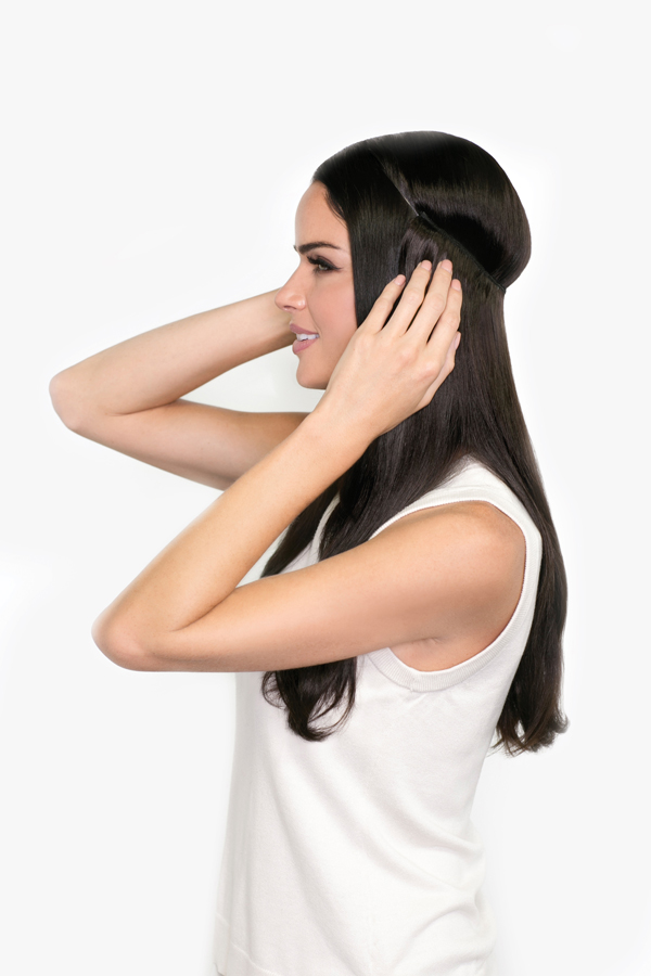 The miracle wire that attaches across the front of the extensions sits about an inch to three inches behind your hairline. The back of the hair extensions, containing all of the Remy hair, slides down just under the occipital bone. When fitted and applied correctly, the extensions will be snug and comfortable, ensuring no movement of the extensions. After, you gently pull some of your natural hair out and over the miracle wire to cover/blend your entire halo extension. The weight of your hair lying on top of the halo will keep it secure and in place. When properly applied, the extensions are secure enough to shake your head without the extensions coming off.